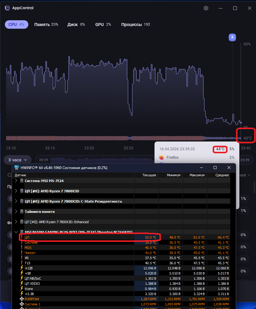 You’re only showing CPU CCD1 (Tdie), while AIDA64 and HWiNFO show all three parameters (CPU (Tctl/Tdie), CPU Die (average), and CPU CCD1 (Tdie)) as separate sensors. You need to configure the CPU (Tctl/Tdie) indicator—it shows the average value of all CPU sensors Tctl/Tdie, just like AIDA64 and HWiNFO do.